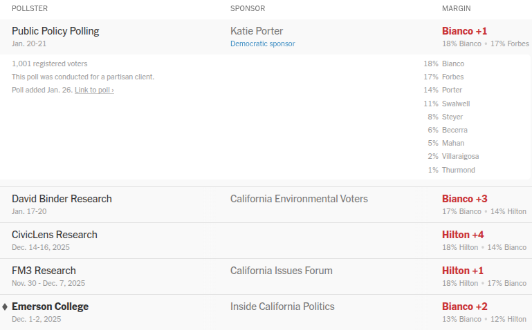 The last 5 California governor polls show 2 Republicans ahead. Source: NY Times